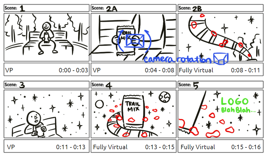 The first, second half, and third scenes will be virtual production and the rest of them will be done fully virtually. The park and the space will be our background settings. My part in this project is making a Nut Asteroid FX that is spinning around the trail mix package.