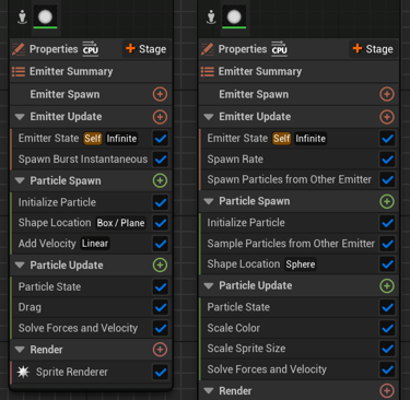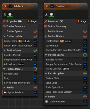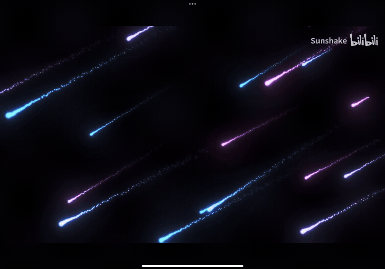 As the new reference is also quite simple but has a more interesting visual, I changed the ribbon renderer to a sprite renderer. Now they have a stardust while falling. I could change the colors of them as well, but I just left them in a yellow-ish white color to maintain a little bit of realistic visual.